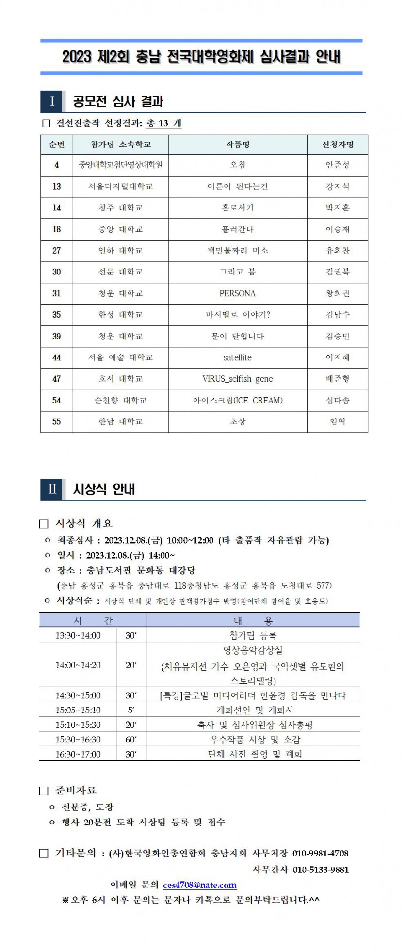 2023 제2회 충남 전국대학영화제 심사결과 안내 페이지 정보 작성자 사무국 댓글 댓글 0건 조회Hit 646회 작성일Date 23-12-06 11:31 본문 - 페이스북 공유 트위터 공유 목록 답변 글쓰기 이전글2023 제2회 충남전국대학 영화제 23.12.06 다음글2023 제2회 충남 전국대학영화제 결과발표 지연안내 23.12.05 댓글 0 댓글목록 등록된 댓글이 없습니다.