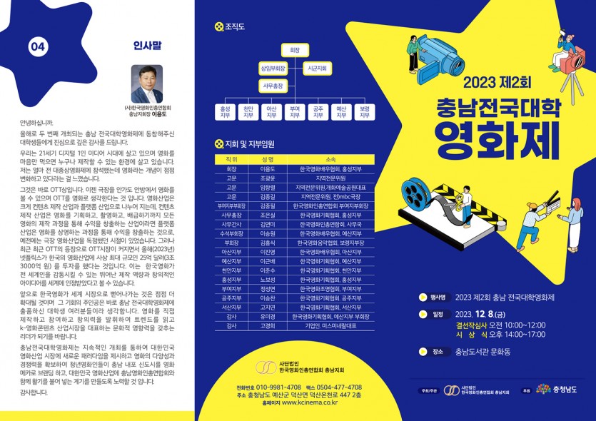 2023 제2회 충남전국대학 영화제 페이지 정보 작성자 사무국 댓글 댓글 0건 조회Hit 505회 작성일Date 23-12-06 17:51 본문 - 페이스북 공유 트위터 공유 목록 답변 글쓰기 이전글jack 24.06.03 다음글2023 제2회 충남 전국대학영화제 심사결과 안내 23.12.06 댓글 0 댓글목록 등록된 댓글이 없습니다.